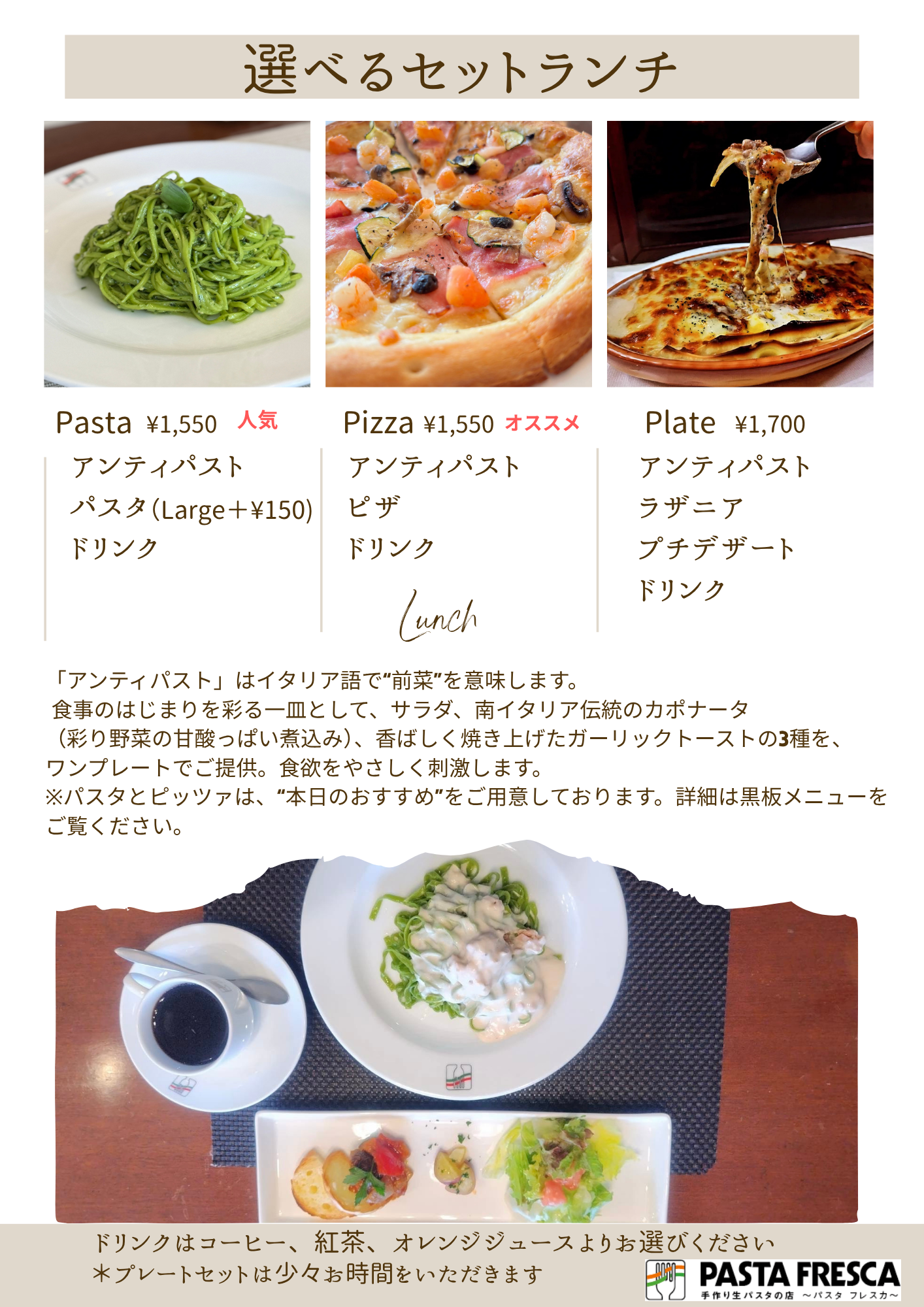 選べるランチセットは、シェフおすすめのモチモチ食感の自家製生パスタ、香ばしいクリスピー生地のピッツァ、そしてチーズがとろける自家製ラザニアの3種類からお選びいただけます。