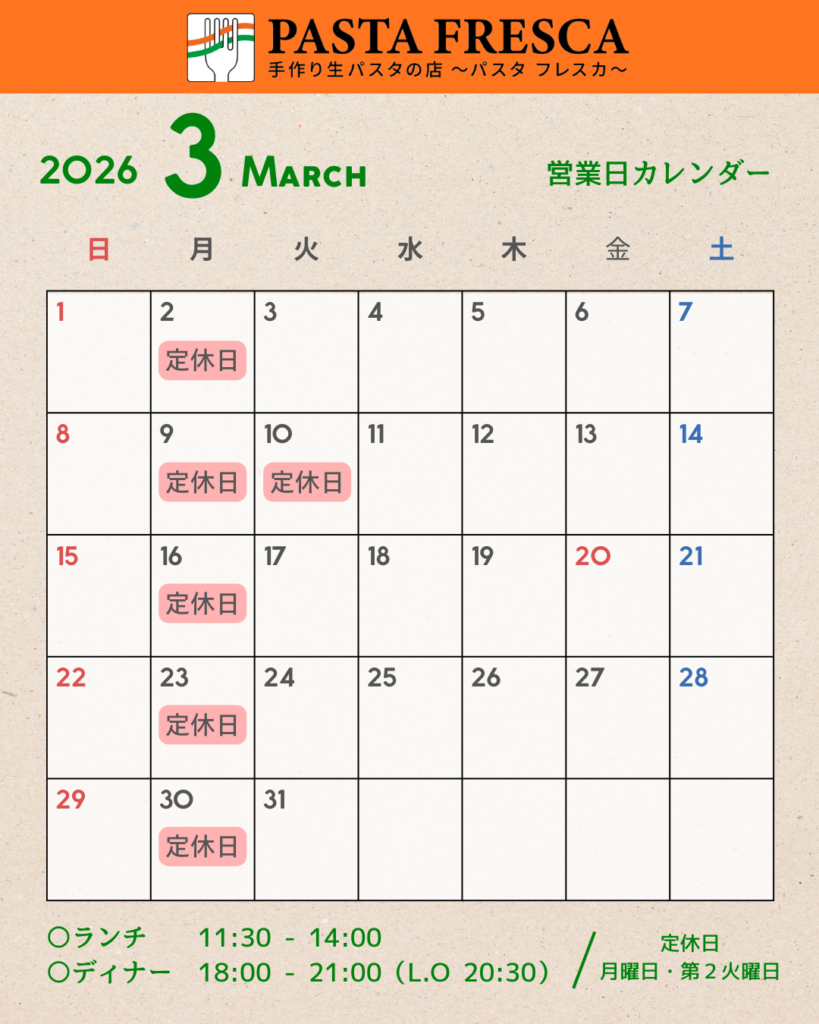 3月の定休日は 2日(月)・9日(月)・10日(火)・16日(月)・23日(月)・30日(月) となります。