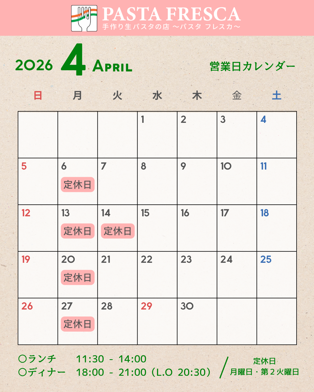 パスタフレスカ、4月の営業日をお知らせします♪